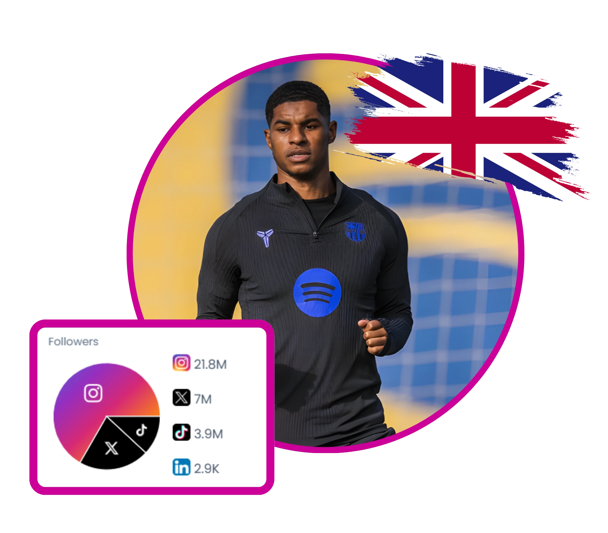 Marcus Rashford is a global professional footballer with a massive cross‑platform presence across Instagram, TikTok, Twitter, and LinkedIn. Content centers on his career with Barcelona and England, match highlights, training, awards, and fan engagement, plus personal moments with fans and his dog. He projects elite athleticism, team devotion, and a media‑savvy public image that resonates with global football audiences.