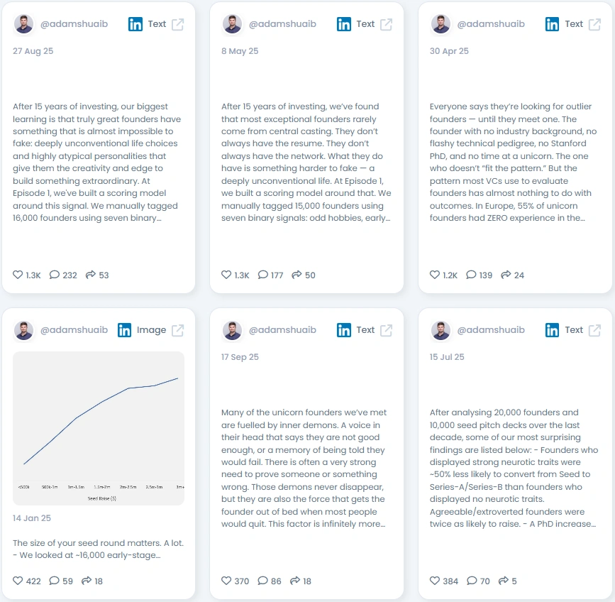 People listen to Adam because he gives data a soul. His posts break down complex analyses into digestible insights that feel relevant to anyone building or backing startups. Instead of VC clichés, he uses clear writing and grounded storytelling. Each post feels like an aha moment, revealing patterns in founder psychology that most investors overlook. His calm, analytical tone builds trust, while his data-backed storytelling keeps readers hooked.