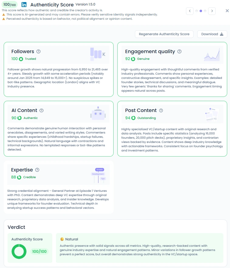 Adam has a perfect Favikon Authenticity Score of 100/100, a rare feat in professional thought leadership. His writing is human, unfiltered, and grounded in real research. He engages directly with readers through meaningful discussions and responses from verified professionals. His posts blend storytelling and substance without falling into the trap of motivational fluff. Whether he’s sharing founder data or life lessons from investing, his insights always feel earned, not manufactured.