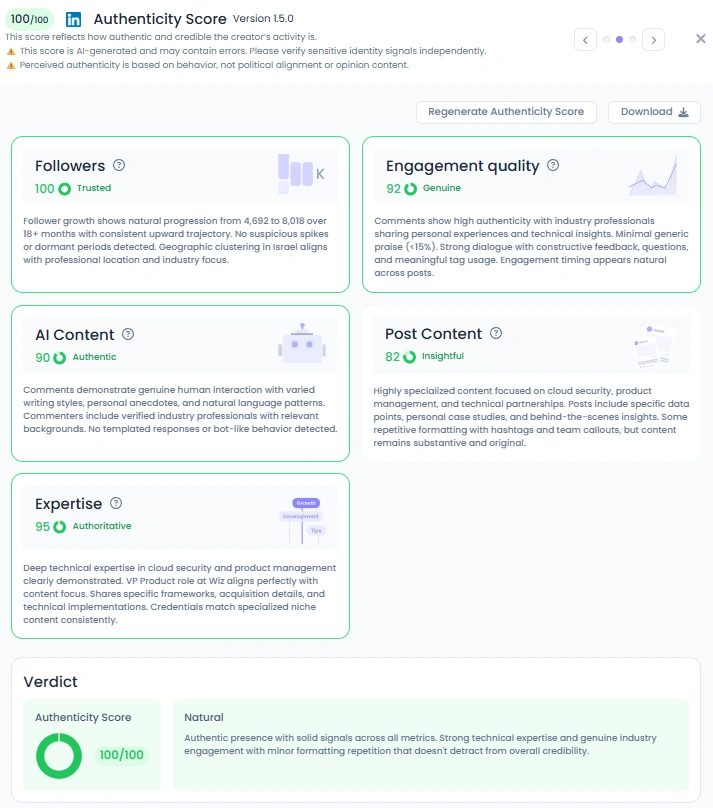 His audience grew from 4,692 to 8,018 over about eighteen months. Engagement quality is 92 with constructive replies and genuine dialogue. Post content is 82 for specialized, technical updates. Expertise is 95, consistent with a VP product voice in cloud security. Overall Influence Score is 5,404 points, placing him top 1% on LinkedIn Israel and strong in cybersecurity rankings.