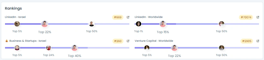 His influence score sits at 3 362 points, ranking him among the top 5 percent of Israeli LinkedIn creators in business and venture capital. His following has grown steadily from around 5 000 to 6 500 without artificial spikes. Engagement quality is strong, with high comment ratios and verified professional interactions. Each post attracts authentic dialogue rather than empty reactions, proving that his audience values substance over style.